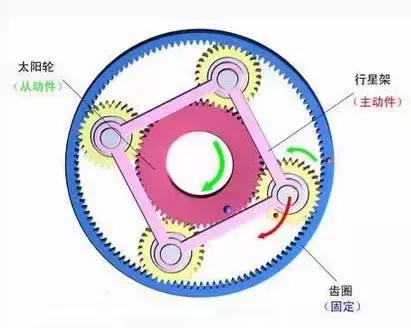 2)齒圈固定,行星架主動,太陽輪被動。