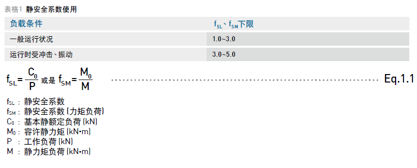 當直線導軌使用在慢速運動或作動頻率不高的狀況下,需考慮靜安全系數(shù)。根據(jù)不同的使用狀況,計算靜負荷必