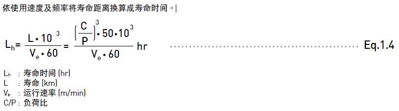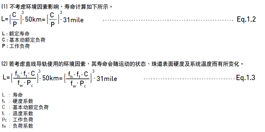 直線導(dǎo)軌的壽命會因?qū)嶋H承受工作負(fù)荷而不同,可依選用之直線導(dǎo)軌的基本動額定負(fù)荷及工作負(fù)荷推算出使用壽命。