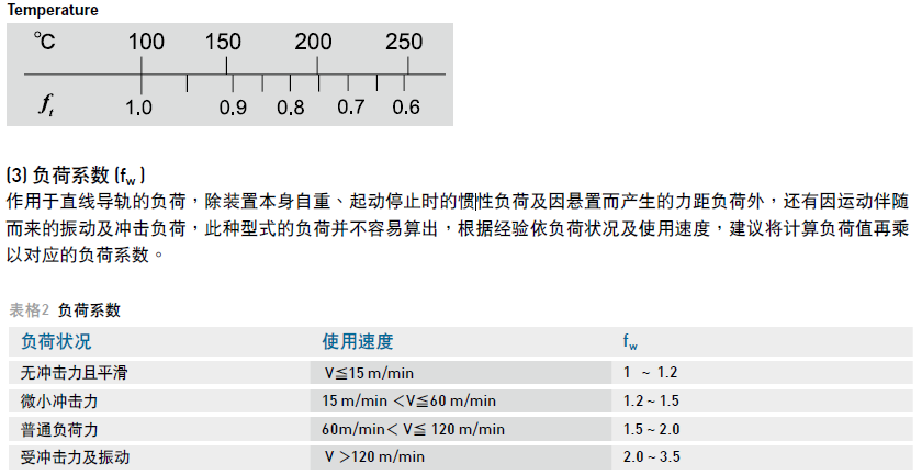 系統(tǒng)溫度會對直線導(dǎo)軌的材質(zhì)有影響,當(dāng)溫度高于100oC時直線導(dǎo)軌的額定負(fù)荷及使用壽命將會降低,此時動、靜額定負(fù)荷為尺寸表列值再乘以對應(yīng)的溫度系數(shù)。由于有些配件是塑料材質(zhì)較不耐高溫,故建議使用溫度應(yīng)低于100oC。