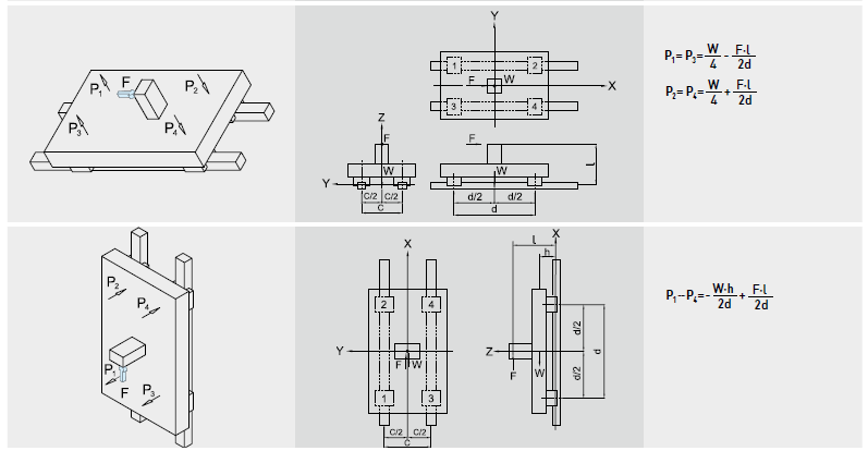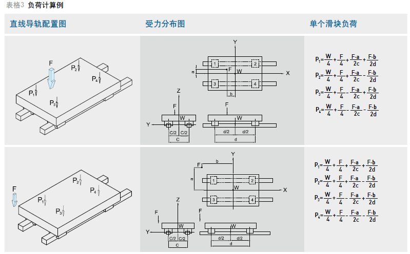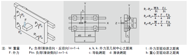 工作負(fù)荷的計算方式會隨實際受力分布的情形而產(chǎn)生變化,例如承載物體本身重心的位置、施力的位置,以及運行時起動、停止的加速度慣性力等皆對負(fù)荷的計算發(fā)生影響,因此使用直線導(dǎo)軌時必須仔細(xì)考慮各種負(fù)荷狀況,以計算出最正確的負(fù)荷值。