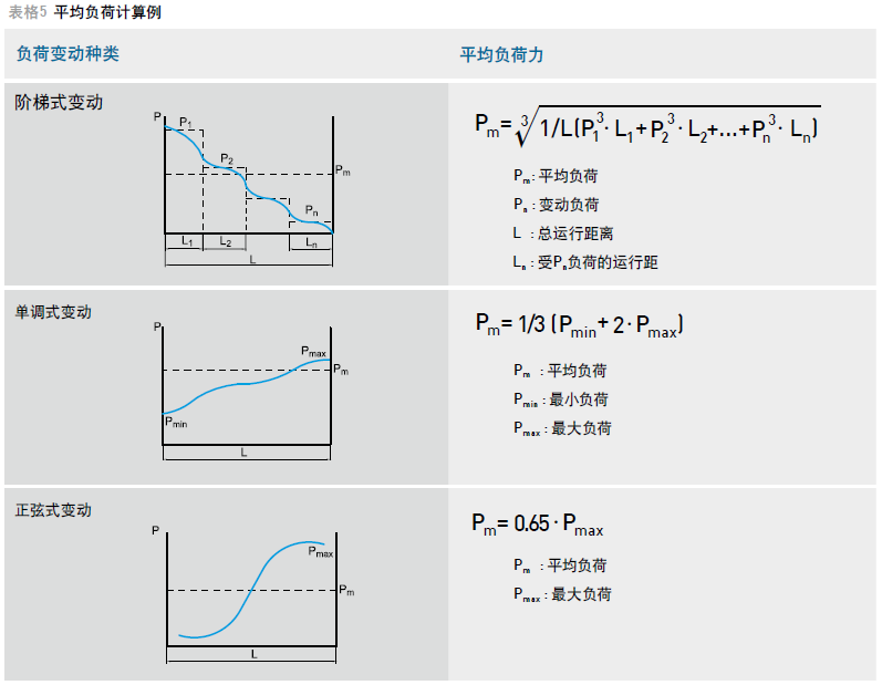 在運行中滑塊承受的負(fù)荷有時并不是均等的,比方搬送裝置的運行,其前進(jìn)時額外承受貨物的重量,退回時則只承受裝置本身的重量,負(fù)荷呈現(xiàn)階梯式變化,因此必須求出運行中的平均負(fù)荷以計算壽命。平均負(fù)荷的定義是與負(fù)荷變動條件下壽命相等的等效負(fù)荷值。