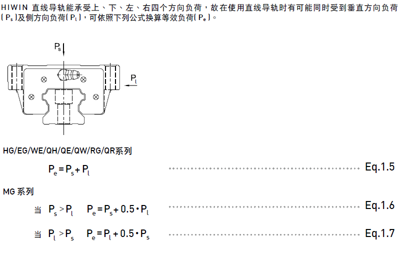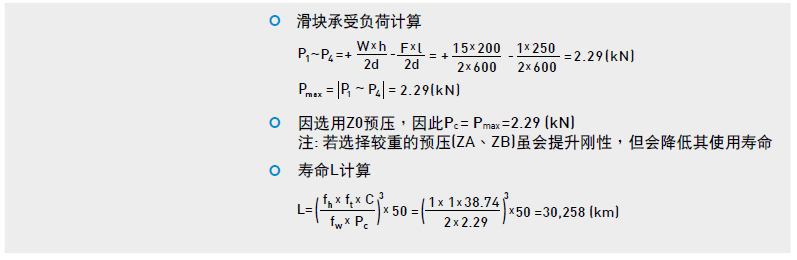 根據(jù)經(jīng)驗選用直線導(dǎo)軌的型式、規(guī)格,再依實際使用情況估算單個滑塊最大工作負(fù)荷,計算動額定負(fù)荷與工作負(fù)荷之負(fù)荷比推算出其使用壽命。