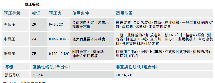 A、無預(yù)壓:標示為Z0;預(yù)壓力為 0~ 0.02C ;使用條件:負荷方向固定且沖擊小,精度要求低;適合范圍:搬送裝置,自動包裝機,自動化產(chǎn)業(yè)機械,一般工業(yè)機械的 XY軸,焊接機,熔斷機,工具交換裝置