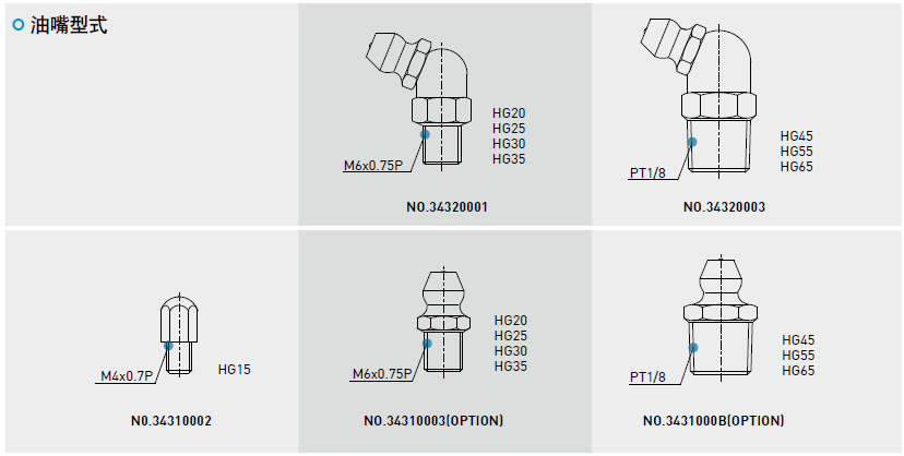依客戶(hù)需要在滑塊前端或后端裝上油嘴以供手動(dòng)打油,HG系列特別在端蓋側(cè)邊預(yù)留側(cè)油孔位置安裝油嘴(一般為直油嘴),提供側(cè)向打油,側(cè)向打油的位置建議在非側(cè)基準(zhǔn)邊,但若有特殊需要亦可放在側(cè)基準(zhǔn)邊。客戶(hù)如有上述側(cè)向打油需求請(qǐng)與我們聯(lián)絡(luò)。使用接管方式自動(dòng)供潤(rùn)滑油脂之直線(xiàn)導(dǎo)軌,則可依連接管型式選用安裝油管接頭。
