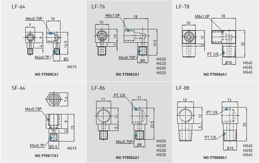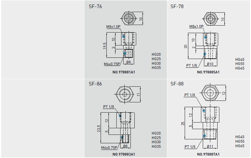 建議使用油黏滯度約為30~150cSt之潤(rùn)滑油潤(rùn)滑直線(xiàn)導(dǎo)軌,客戶(hù)可先跟我們說(shuō)明需要使用油潤(rùn)滑,出貨之直線(xiàn)導(dǎo)軌將不會(huì)封入潤(rùn)滑油脂。油管接頭型式
