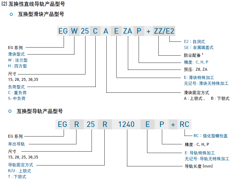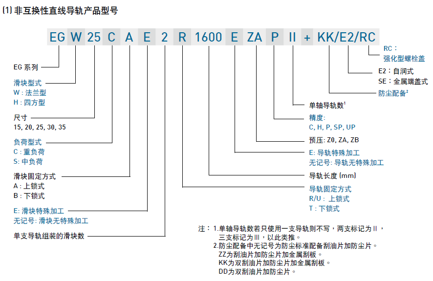 EG系列分為非互換性及互換性型兩種直線導(dǎo)軌,兩者規(guī)格尺寸相同,主要差異點在于互換性型之滑塊、導(dǎo)軌可單獨互換使用,較便利,但其組合精度無法達到非互換性型之超精密級以上的精度,不過由于HIWIN互換性型之組合精度目前已達到一定的水平,對不需配對安裝直線導(dǎo)軌的客戶而言,是一項便利的選擇。直線導(dǎo)軌的產(chǎn)品規(guī)格型號主要標明直線導(dǎo)軌尺寸、型式、精度等級、預(yù)壓等規(guī)格要求,以利訂貨時雙方對產(chǎn)品的確認。