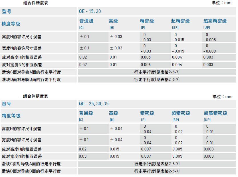 QE系列直線(xiàn)導(dǎo)軌的精度,分為普通、高、精密、超精密、超高精密級(jí)共五級(jí),客戶(hù)可依設(shè)備精度需求選用精度。