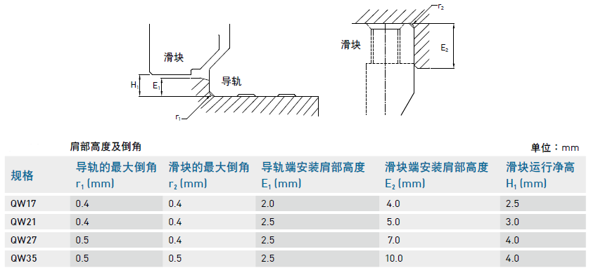 3、安裝注意事項, 我們在超導(dǎo)軌的時候,要注意安裝面肩部高度及倒角,安裝直線導(dǎo)軌時必須注意安裝面肩部的狀況是否適當,如倒角過大,凸出的地方易造成直線導(dǎo)軌精度不良,而高度過高則會干涉滑塊。故如果能依照建議要求安裝面肩部,安裝精度不良即可排除。下表為QW靜音安裝面肩部高度及倒角相關(guān)參數(shù)。